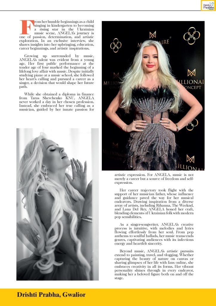 With a growing presence on social media platforms like Instagram and YouTube, ANGELA continues to inspire audiences worldwide. Through her music and art, she seeks to spread joy, positivity, and the rich cultural heritage of Ukraine.