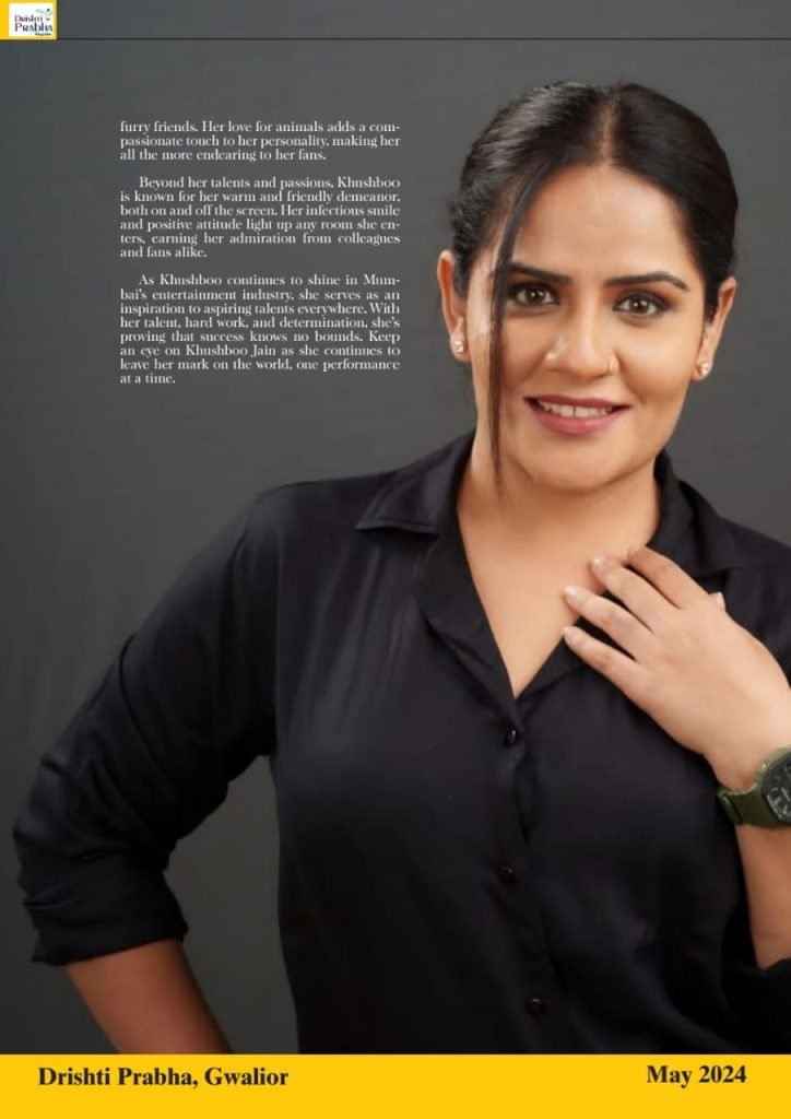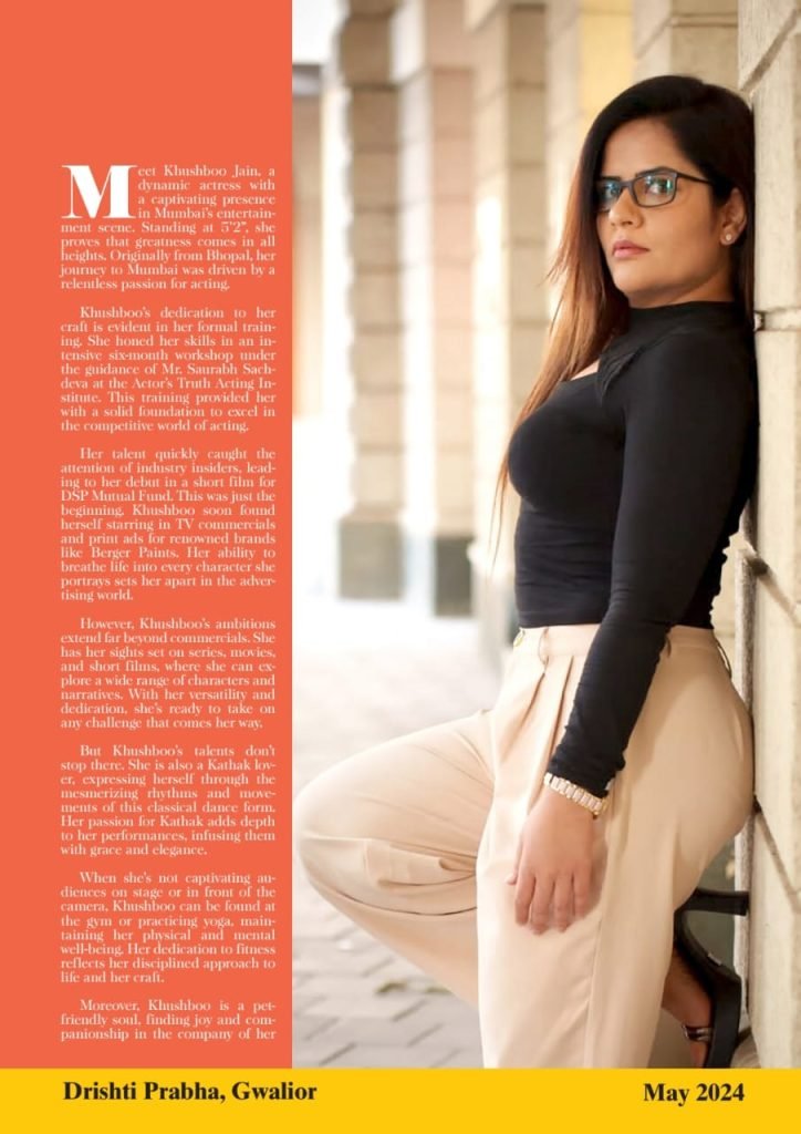 Meet Khushboo Jain, a dynamic actress with a captivating presence in Mumbai’s entertainment scene. “, she proves that greatness comes in all heights. Originally from Bhopal, her journey to Mumbai was driven by a relentless passion for acting.Khushboo’s dedication to her craft is evident in her formal training.