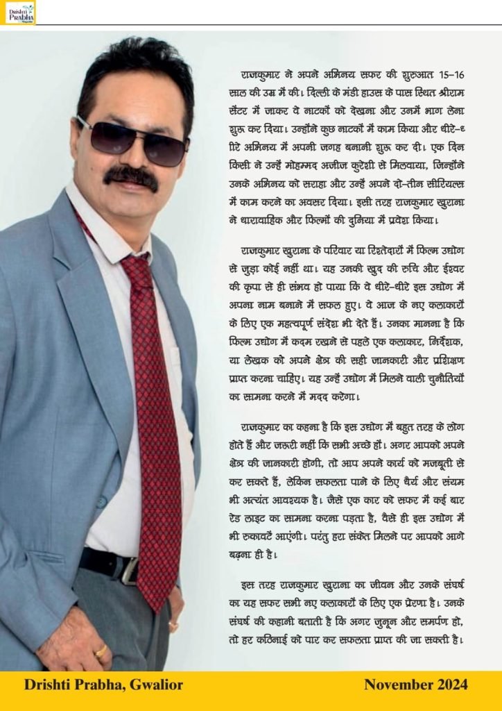 वैसे ही इस उद्योग में भी रुकावटें आएंगी। परंतु हरा संकेत मिलने पर आपको आगे बढ़ना ही है।इस तरह राजकुमार खुराना का जीवन और उनके संघर्ष का यह सफर सभी नए कलाकारों के लिए एक प्रेरणा है। उनके संघर्ष की कहानी बताती है कि अगर जुनून और समर्पण हो, तो हर कठिनाई को पार कर सफलता प्राप्त की जा सकती है।