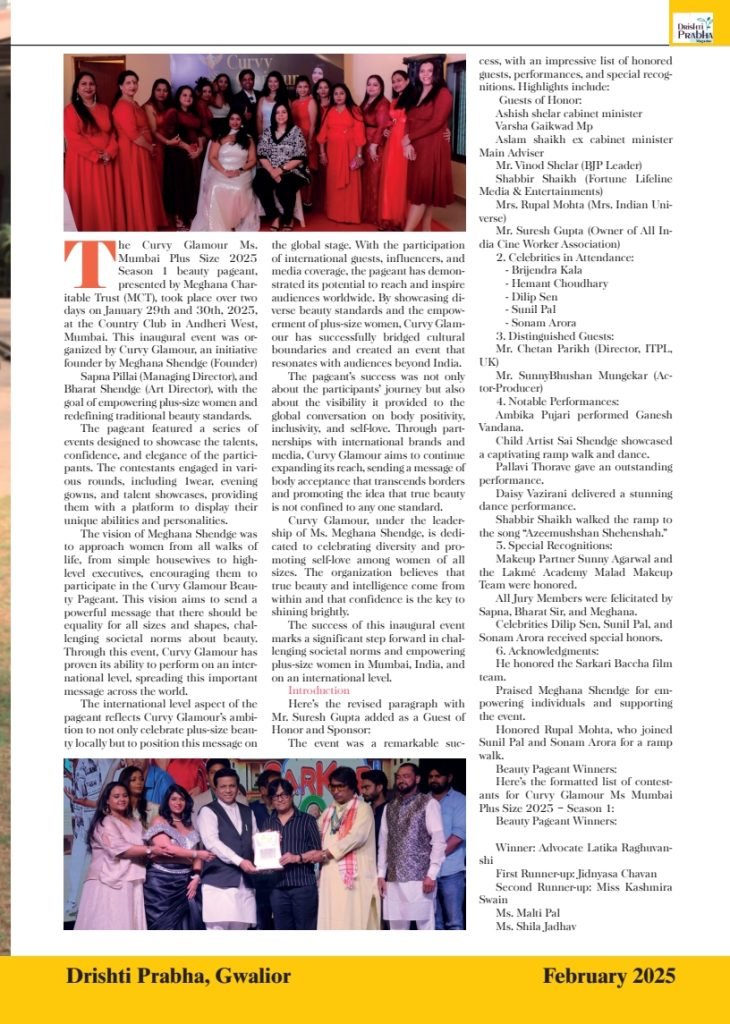 The Curvy Glamour Ms. Mumbai Plus Size 2025 Season 1 beauty pageant, presented by Meghana Charitable Trust (MCT), took place over two days on January 29th and 30th, 2025, at the Country Club in Andheri West, Mumbai. This inaugural event was organized by Curvy Glamour, an initiative founder by *