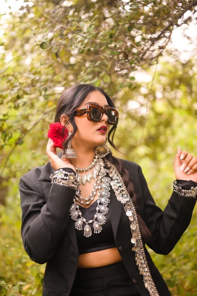 The look showcased in this exclusive photoshoot—a black boss-vibe ensemble elevated with heavy oxidised silver jewellery—captures her signature vision: